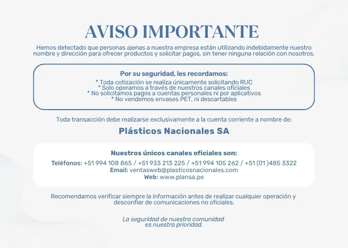 Plásticos Nacionales S.A. es una empresa peruana con 56 años en el mercado nacional de envases plásticos. Cuenta con personal competente, experimentado y orientado a satisfacer la demanda de sus clientes. Especialistas en el diseño y desarrollo de envases, ofrecemos productos fabricados en los procesos de soplado y de inyección, atendiendo a las diferentes industrias tales como: cosmética, alimenticia, química, farmacéutica, veterinaria, agroindustrial, lubricantes, pinturas, pegamentos y adhesivos, entre otros.